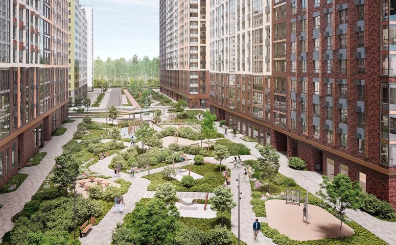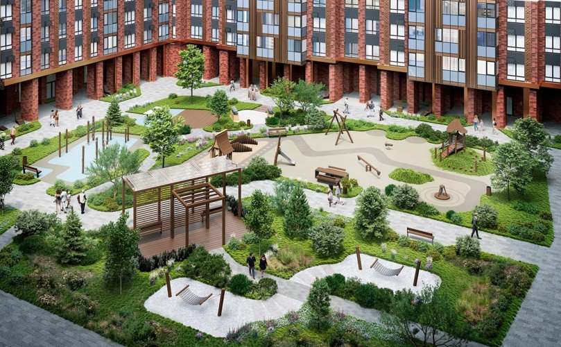 В комплексе предусмотрен широкий зеленый бульвар со спортивными и игровыми площадками, зонами отдыха и маленькой городской площадью, беговые и велодорожки. Для любителей экстремальной езды на велосипеде предусмотрен памп-трек с ямами и кочками.